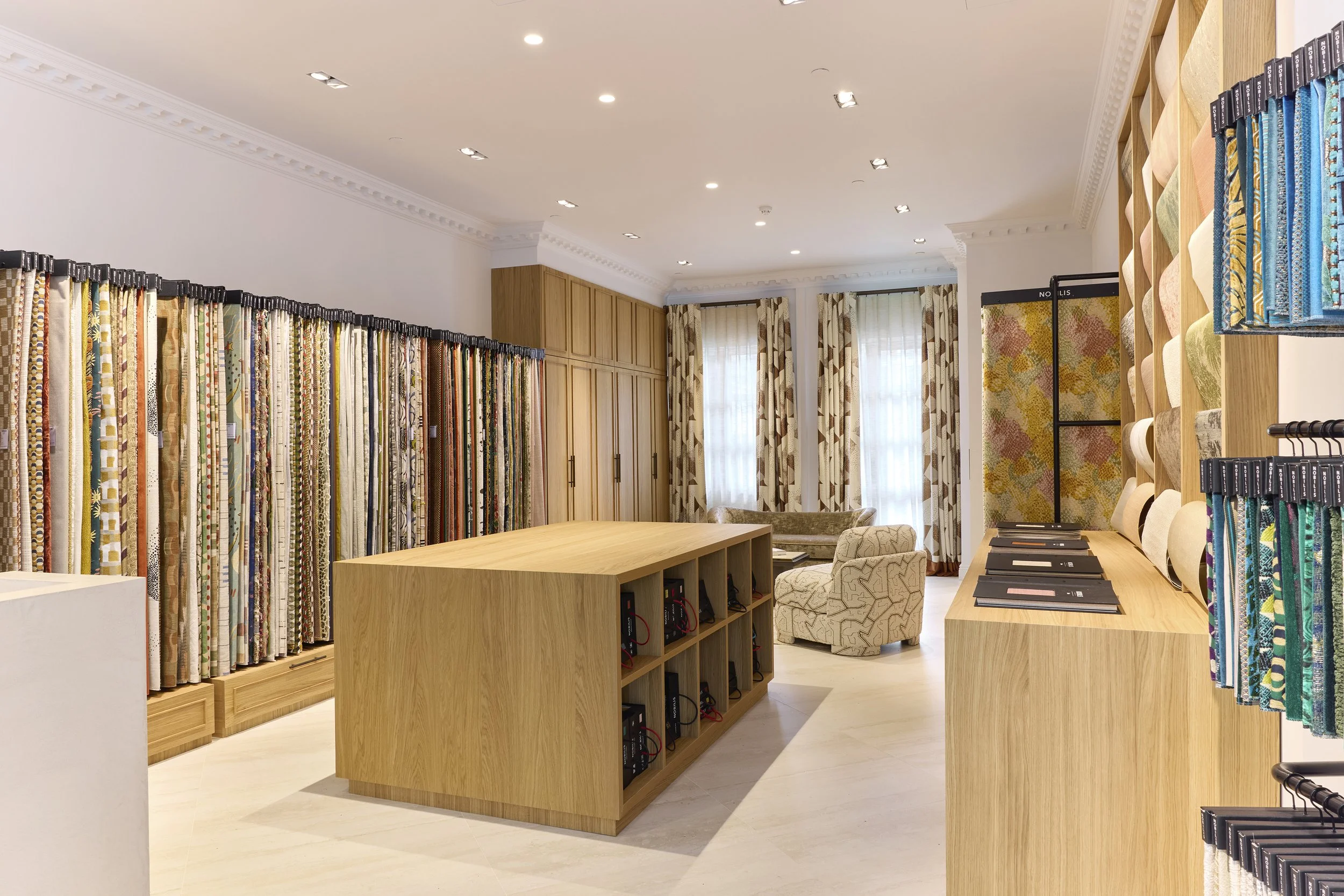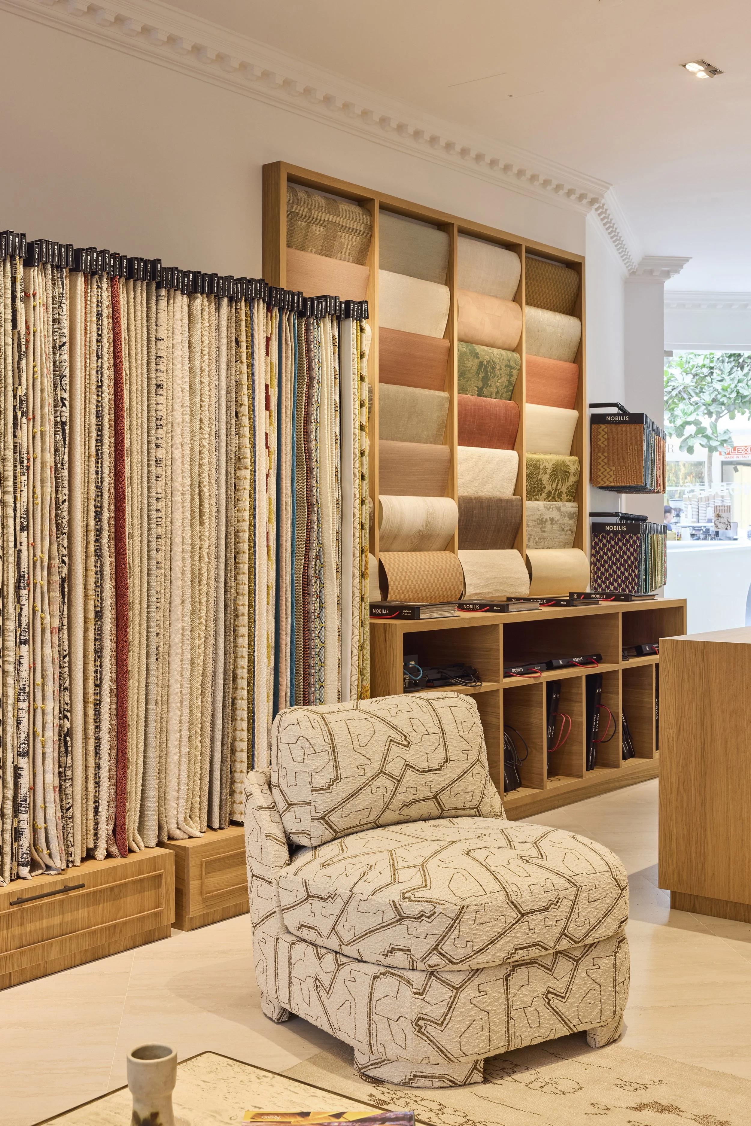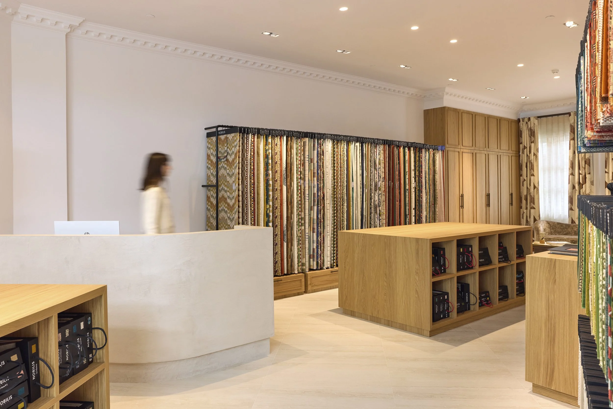 Chelsea Harbour is known for its high end showrooms, each space designed to showcase the companies individual style. The client had a brief of wanting to create a modern space to complement the beautiful fabrics they produce. The previous space had a dark colour pallet which made it feel a lot smaller, by changing the floor to a light travertine and designing a very minimalist micro cement reception desk, the space feels a lot lighter and fresher. Introducing a nice oak veneer creates a bit of warmth against the cooler and more neutral colour pallet