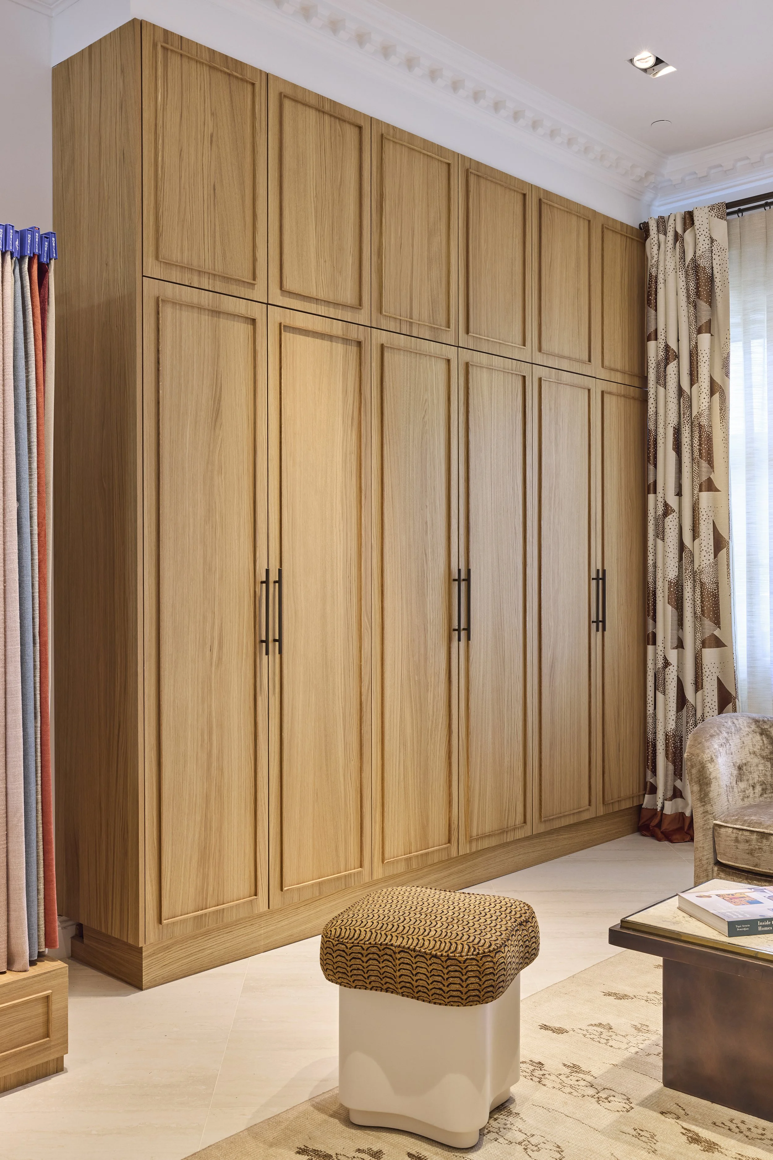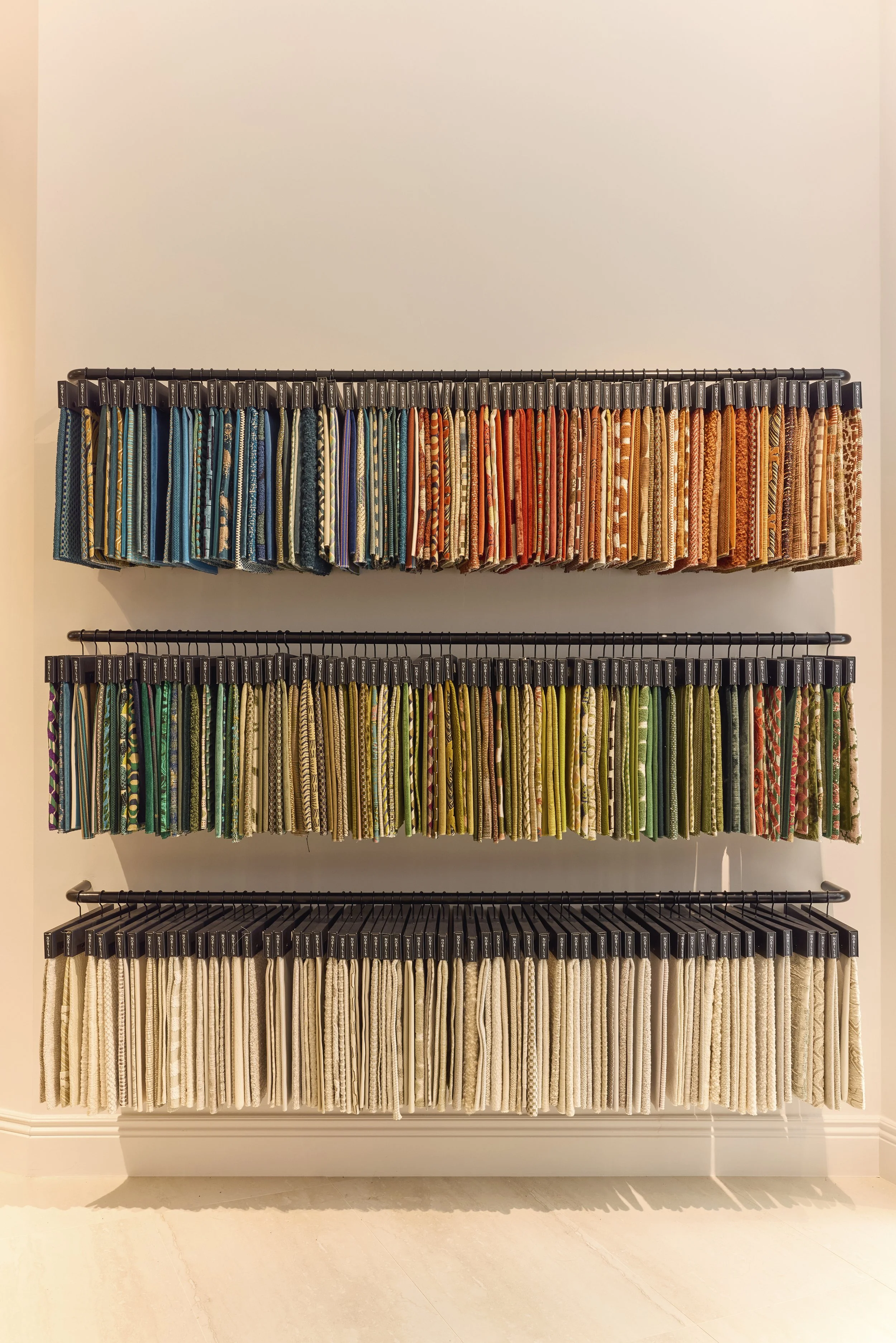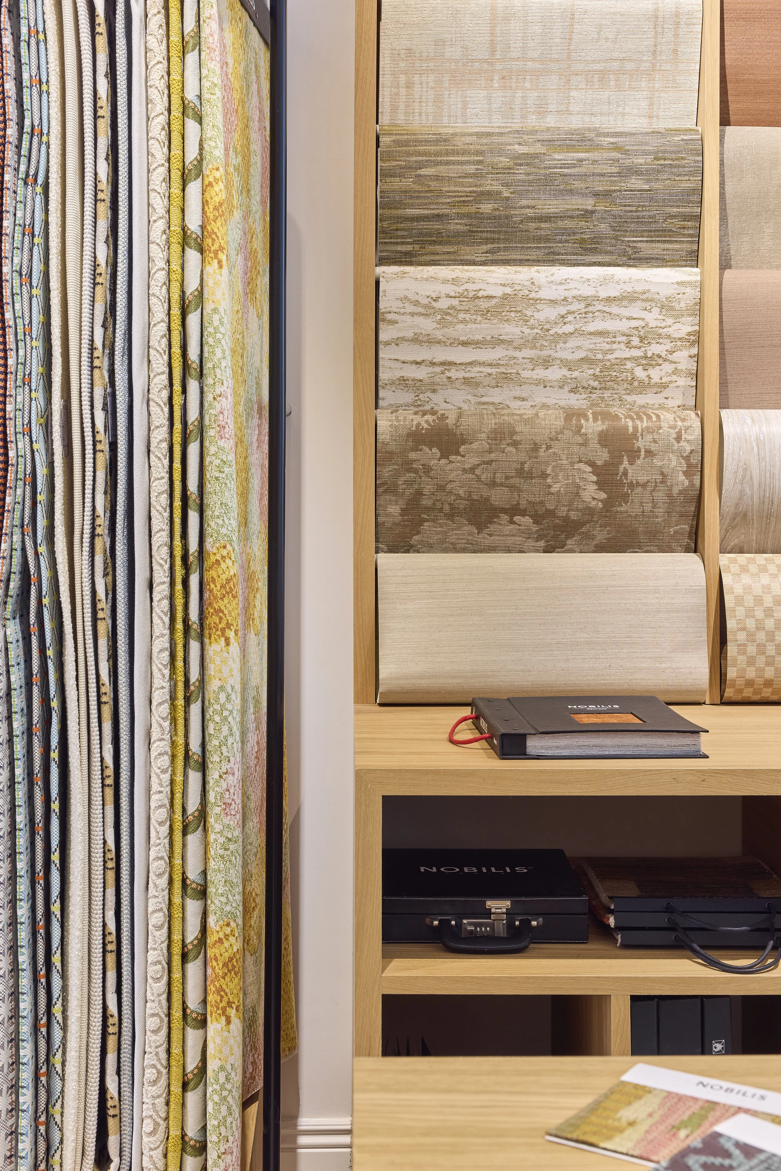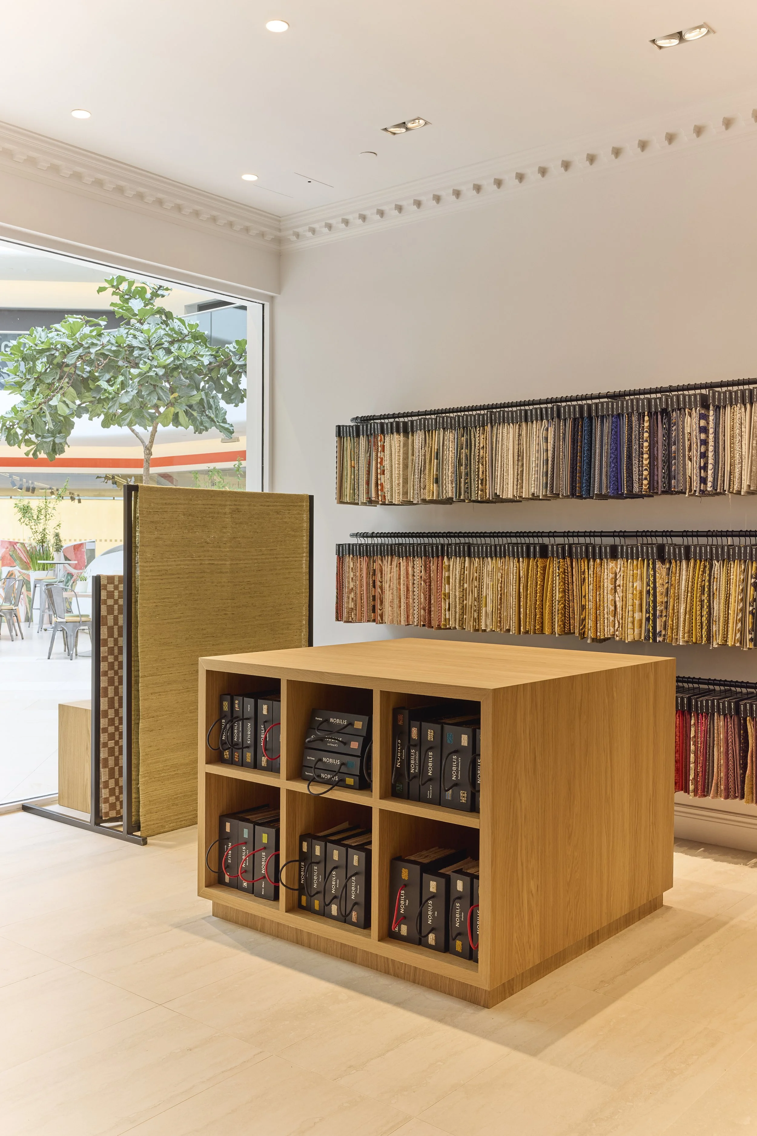 Chelsea Harbour is known for its high end showrooms, each space designed to showcase the companies individual style. The client had a brief of wanting to create a modern space to complement the beautiful fabrics they produce. The previous space had a dark colour pallet which made it feel a lot smaller, by changing the floor to a light travertine and designing a very minimalist micro cement reception desk, the space feels a lot lighter and fresher. Introducing a nice oak veneer creates a bit of warmth against the cooler and more neutral colour pallet